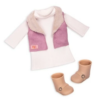 Meet Kinzie and her adorable puppy! This Our Generation 18-inch doll has dark-blue eyes that open and close, and her long black hair is fun to brush and style! Kinzie loves to walk her loyal pal around the neighborhood — especially to the dog park. Use the pink leash to keep her pup always by her side, and give your furry friend extra style by easily clipping the barrel accessory to the collar! Kinzie has a soft, cuddly body and can rotate her arms and legs to play fetch with the pink ball. She can also easily change outfits to dress up for any activity! She is wearing a comfy sweater dress, a pink vest with a cute faux-fur collar, and easy-to-slip-on booties. Her outfit even matches the mini bow on her pup’s ear! The best styles are those we can share with our pets!
