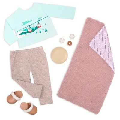 - Includes: doll, 2 outfits, 3 cookies, plate, blanket, slippers, boots, hot chocolate mug with marshmallows, storybook, and bookmark