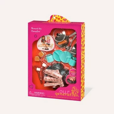 Get ready for the ultimate camping trip with the Campfire accessory set from Our Generation! This set includes a flickering bonfire, roasting sticks, marshmallows, hot dogs, s’mores, a pot, a pan, a ladle, two mugs, and two plates. Each piece is perfectly sized for Our Generation dolls (or other 18-inch dolls), bringing more personality and excitement to playtime. (Dolls sold separatley. Compatible with American Girl dolls)