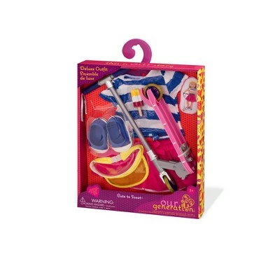 Roll, glide, and breeze your way through summer with the Cute to Scoot Deluxe Scooter Outfit from Our Generation! This deluxe 7pc outfit for 18-inch dolls will have you flying down the sidewalk, giggling all the way (which is one of the things OG kids do best!) The scooter is the perfect size for 18-inch dolls, and has real tassles on the handle bars. Watch them whirl as you go! The cute summer style of the blue striped lace-print t-shirt, pink skirt with bow, and matching blue flats makes fashion a breeze. Stay cool in the heat with the bright sunny-yellow visor and the frozen treat! The doll in the picture is Layla. (Dolls sold separately, available at Target.)