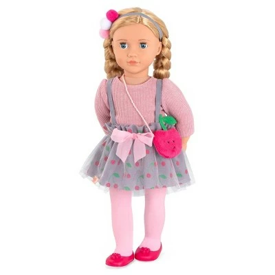 Cherish unique style with the Our Generation Cherry Sweet fashion outfit for 18-inch dolls! Use the easy-open closures to quickly put on the sweater, and slip on the cherry-print dress with the fun suspenders! This outfit also includes playful accessories like a pompom hair elastic that will add pops of color to your doll’s hairstyle, and a cherry bag that holds her most stylish items. You can even mix and match this fashion set with other colorful Our Generation doll clothes for more creative looks! (Dolls sold separately)