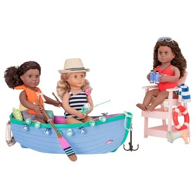 Your little one will love the Fun Day Sun Day outfit from Our Generation for her favorite 18-inch dolls! This fun set has bright and colorful water accessories that include a bathing suit, life jacket, goggles, towel, shoes, and four seashells to start a beautiful collection. These hiking accessories add an extra splash of imagination to playtime, and it will keep your dolls looking stylish during the summer! (Dolls sold separately. Compatible with American Girl dolls)