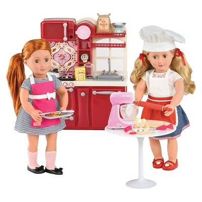 A sprinkle of sugar and a dollop of dreams are the perfect ingredients for hours of pretend baking fun with the Our Generation Master Baker Set, a baking accessory set for 18-inch dolls! Whether you’re practicing to be the next master chef or just making some sweet treats to share with your friends and family, this kitchen accessory set for dolls has everything you need. Dress your dolls in the adorable chef’s hat and apron to protect their outfits. Measure out your ingredients with the scale, measuring cups and spoons, scrape them into the stand mixer with the spatula, and turn it on – there are three mixer speed settings, so your baking will turn out just right! This set comes with all kinds of kitchen tools and sweet baked treats that are perfect for a picnic or a tea party. The only limit to what you can cook up with this doll baking set is your imagination! The dolls pictured are Noa and Jenny. (Dolls and outfits sold separately, available at Target. Compatible with American Girl dolls.)