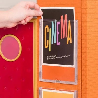 Treat your 18-inch dolls to a night at the movies with the Our Generation Movie Theater set! This Hollywood-inspired accessory includes 50 items that give your moviegoers a playful cinematic experience. Pick from the six movie-themed posters to preview what’s playing, and create fun messages on the letter board with the 74 characters and symbols! Purchase your tickets at the booth with the paper bills and coins, then build a snack basket at the concession stand with a variety of food and drinks! Press the button on the popcorn machine to watch it spin, and turn on the lights in the theater before the movie begins! This cinema playset also features a ledge at the bottom of the screen to hold your tablet, so you can watch your favorite films and shows together with your dolls! Just put their drinks in the seat cup holders, close the lights, and pull back the curtains to enjoy the feature presentation! (Tablet not included. Dolls and outfits sold separately)