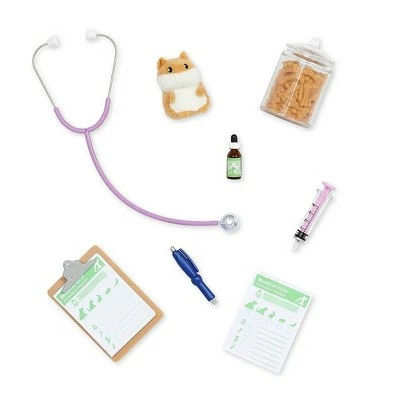 - Includes: 18-inch doll, scrubs top with cute animal prints, pleated skirt, undies, doctor’s coat, plush hamster, pair of shoes, stethoscope, clipboard, 2 medical forms, treats jar, pretend syringe, pen, and medicine bottle.