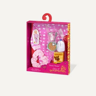Snuggle up beside your favorite 18-inch doll after you dress her in the Our Generation Onesies Funzies outfit! This bedtime get-up is perfect for a slumber party or to spend the day in comfy pj’s! The long-sleeved pajama is covered in a white star print, and it comes with a box and bowl of cereal for a delicious breakfast. Use the sugar shaker for a little extra sweetness, and the scrunchie can tie your doll’s hair so it doesn’t get dunked in the milk – mornings can be so silly! (Dolls sold separately. Compatible with American Girl dolls)