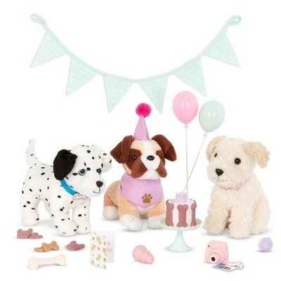 - 20-piece Pet Birthday Set: celebrate your puppy’s special day with the Our Generation Party Pups set!