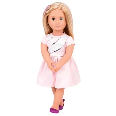 Let your sparkling personality shine a little brighter with a little glitter and Rosalyn, the Our Generation Glitter Tattoo Deco Doll! Rosalyn loves to express herself in many different ways including making up bedtime stories for her little sister, tying her shoelaces in a special way, and by wearing a little bit of extra glitter! Use the included stencils and glitter glue to show off Rosalyn’s sparkling personality by giving her temporary glitter tattoos! When you’re ready for a new design, the tattoos rub off so you can start again. Rosalyn comes wearing a pretty pink satin-finish dress with glittering sequins on the front. She wears purple shoes, and a sparkly matching pink hair bow that looks great in her straight, shoulder-length blonde hair. Rosalyn’s hair is soft and silky and lots of fun to brush and style in lots of ways! (Compatible with American Girl dolls.)