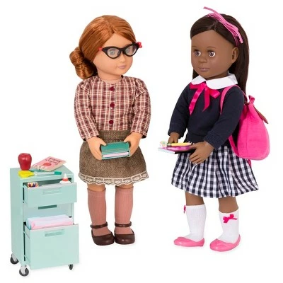 Let your curious 18-inch dolls share their love for learning with the Elementary Class Playset from Our Generation. Featuring everything they need for a fun classroom experience, use the copybooks and textbooks to learn and take notes, and use the fish bowl, red apple, and the rest of the supplies to set up your very own classroom. You can even keep everything neat and tidy in the filing cabinet! When it comes to your imagination, you always make the rules! (Dolls sold separately. Compatible with American Girl dolls)