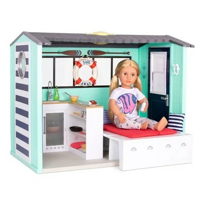 Sail away on oceans of fun with the Our Generation Seaside Beach House! This award-winning beach house playset is the perfect paradise by the sea for 18-inch dolls. Cook up a tasty seaside meal with the lifelike kitchenette accessories and the realistic sounds from the stove. The nautical accessories are perfect for adventure, and when it’s time to rest, convert the kitchen bench into a pull-out bed with a mattress and blanket. Give your doll sweet dreams with a starry projection on the ceiling (with real working lights!) The Seaside Beach House is your getaway by the waves. Photos feature OG dolls Noa, Clarissa, and Dedra. (Dolls and outfits sold separately, available at Target.)